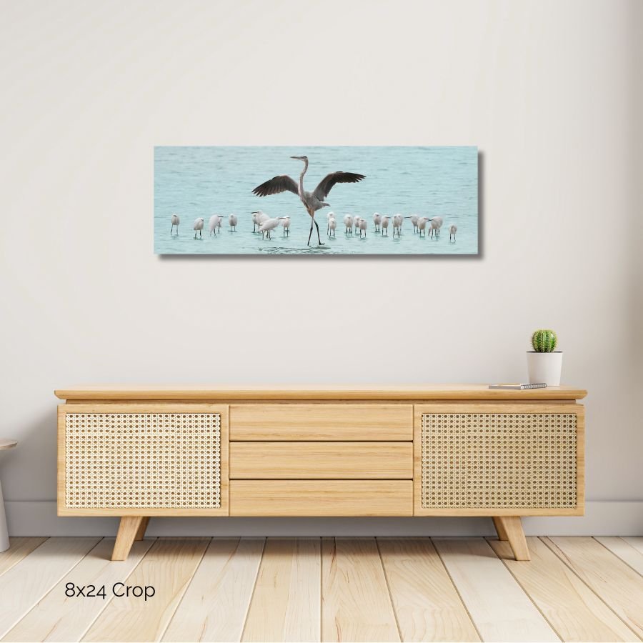 The Lead Performer – Get ready to smile with this lively photograph, “The Lead Performer,” captured at the J.N. “Ding” Darling National Wildlife Refuge on Sanibel Island, Florida. I had spent some time watching this particular Great Blue Heron, who seemed to be putting on a show, joyfully jumping and frolicking as if dancing through the shallows. My camera was ready as he then approached a perfect line of pristine Snowy Egrets. I waited, holding my breath in anticipation for him to join their ranks. And then, he did it! He dramatically threw his magnificent wings out, as if announcing his arrival as the lead performer, with the elegant Snowys perfectly lined up as his backup dancers.
